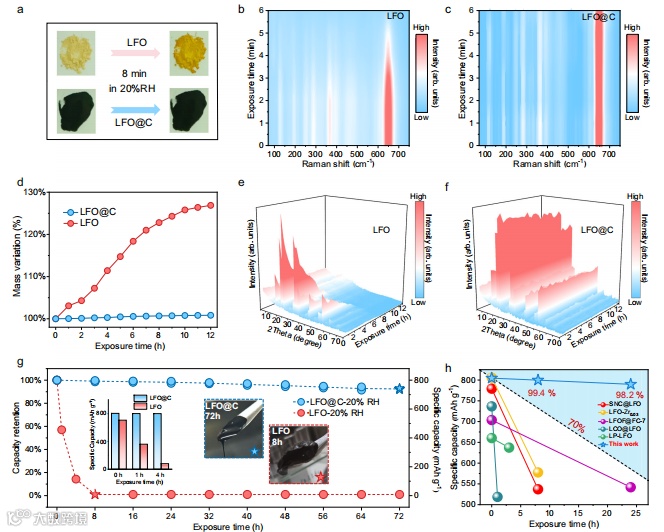 在相对湿度20%的空气中,未包覆的LFO在短短4小时内迅速失效,容量跌至86.1 mAh g-1,颗粒颜色明显加深,电极浆料发生凝胶,已难以加工使用。而碳包覆后的LFO@C即使暴露72小时,容量仍高达743.4 mAh g-1(92.3%保留),表面无变化,浆料依旧保持良好流动性。同时,Raman和XRD原位表征显示:LFO@C在整个暴露过程中结构信号几乎未衰减,表明其晶体保持稳定,无明显降解。对比现有改性方案,LFO@C在相同条件下的容量保持率和暴露时长均处于领先水平,展示出优异的实用环境稳定性。