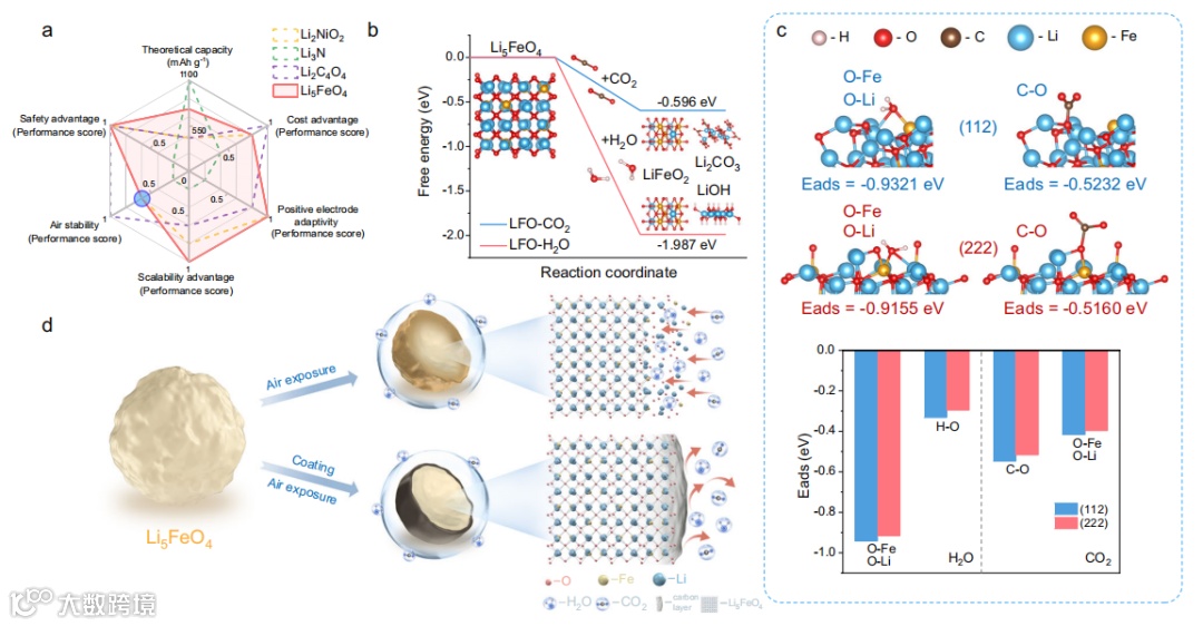Li5FeO4虽具有优异的锂含量和理论容量,但在空气中极易与 H2O 和 CO2 发生化学反应,迅速降解为LiOH、Li2CO3和LiFeO2。通过第一性原理计算,研究团队量化了其与气体分子的反应自由能和吸附能,发现Li5FeO4与H2O的反应性更强,且(112)和(222)晶面为主要吸附活性位点。这为后续的碳包覆策略提供了理论基础,也强调了隔绝空气中水分的必要性。