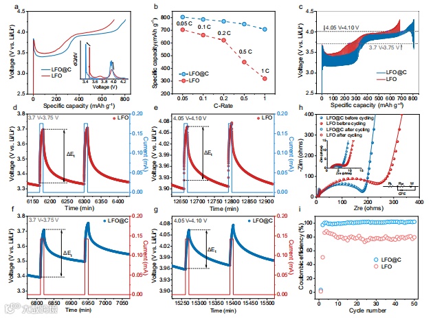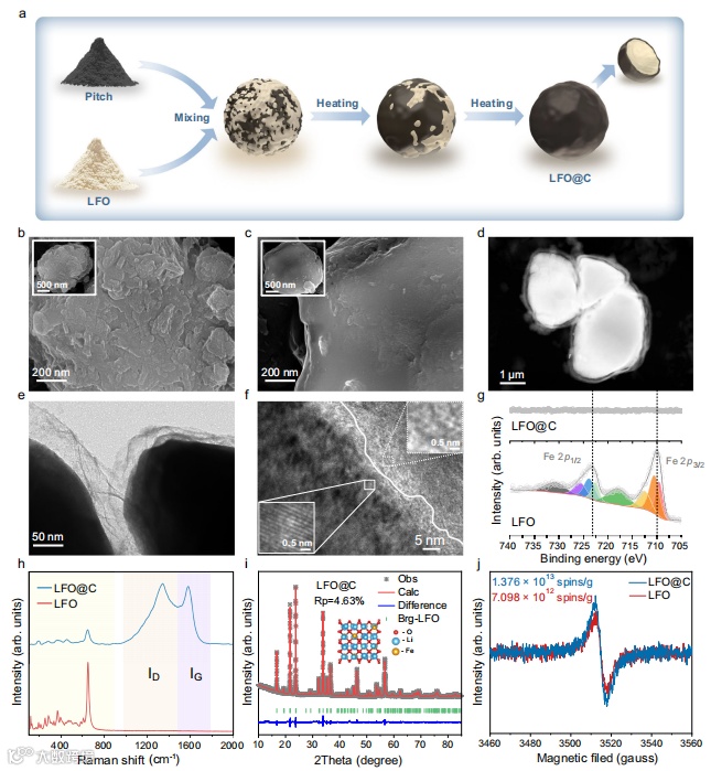 碳包覆后的LFO (LFO@C)在微观结构上发生显著变化。电子显微镜(SEM/TEM)显示,LFO@C颗粒表面被均匀包覆,形成连续致密的碳层,有效隔绝空气中水汽的侵蚀。XPS检测不到Fe和Li信号,进一步验证碳层的封闭性。Raman谱图中出现明显的D、G峰,说明碳层为无定形结构,同时具备一定导电性。此外,电子顺磁共振(EPR)与X射线吸收(XAS)结果显示,碳包覆引入了更多氧空位和结构缺陷,有利于锂离子迁移和电化学活性提升。这意味着碳包覆不仅构建了保护屏障,还优化了电子与离子传输通道,为性能提升打下基础。