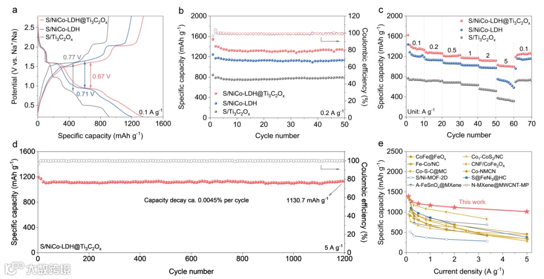 S/NiCo-LDH@Ti3C2Ox的初始容量为1540.5 mAh g−1,初始硫利用率为92.0%,远高于对比样品。在0.1、0.2、0.5、1、2和5 A g−1下,S/NiCo-LDH@Ti3C2Ox的容量分别为1369.6、1275.6、1206.7、1171.0、1120.2和1014.5 mAh g−1。当电流密度恢复至0.1 A g−1时,可逆容量可回升至1232.1 mAh g−1。相比之下,S/NiCo-LDH在5 A g−1的电流密度下容量衰减迅速,这可能是由于其导电性较差所致。在5 A g−1的大电流密度下,S/NiCo-LDH@Ti3C2Ox表现出稳定的长循环性能:经过1200次循环后,容量仍可达1130.7 mAh g−1,每个循环容量衰减率仅为0.0045%。