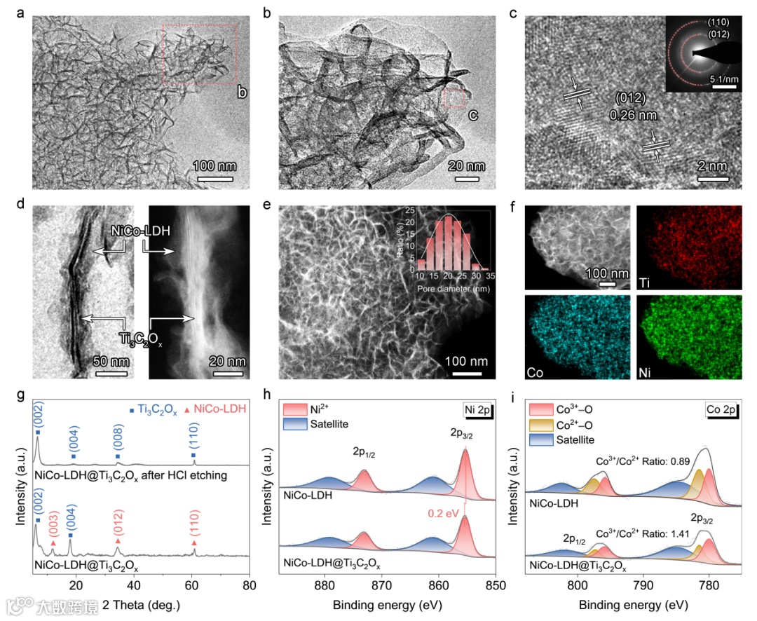 图2. 催化剂NiCo-LDH@Ti3C2Ox的形貌、物性表征