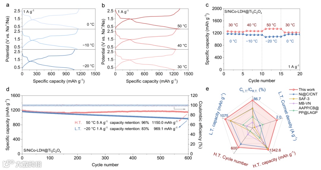 图1. Ni/Co元素变价催化机制实现-20~50℃宽温域、高倍率钠硫电池。