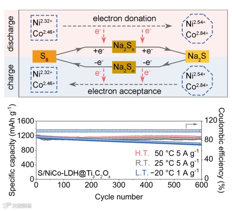 近日,北京航空航天大学周苇团队设计了一种具有蜂窝状结构的NiCo-LDH@Ti3C2Ox,并揭示了其Ni/Co元素变价催化机制,成功解决了上述挑战。实验结果表明,钠硫电池在室温下展现出卓越的高倍率性能和循环稳定性,在−20~50℃的宽温度范围内亦能保持出色的性能(−20 ℃、1 A g−1下循环600圈后容量为969.1 mAh g−1;50℃、5 A g−1下循环600圈后容量为1150.0 mAh g−1)。