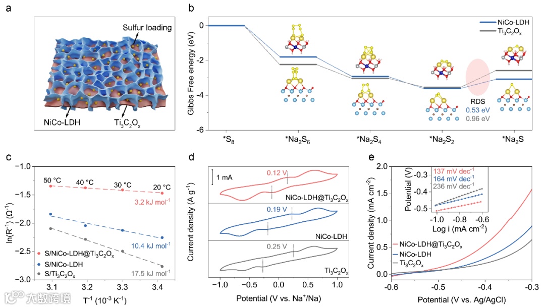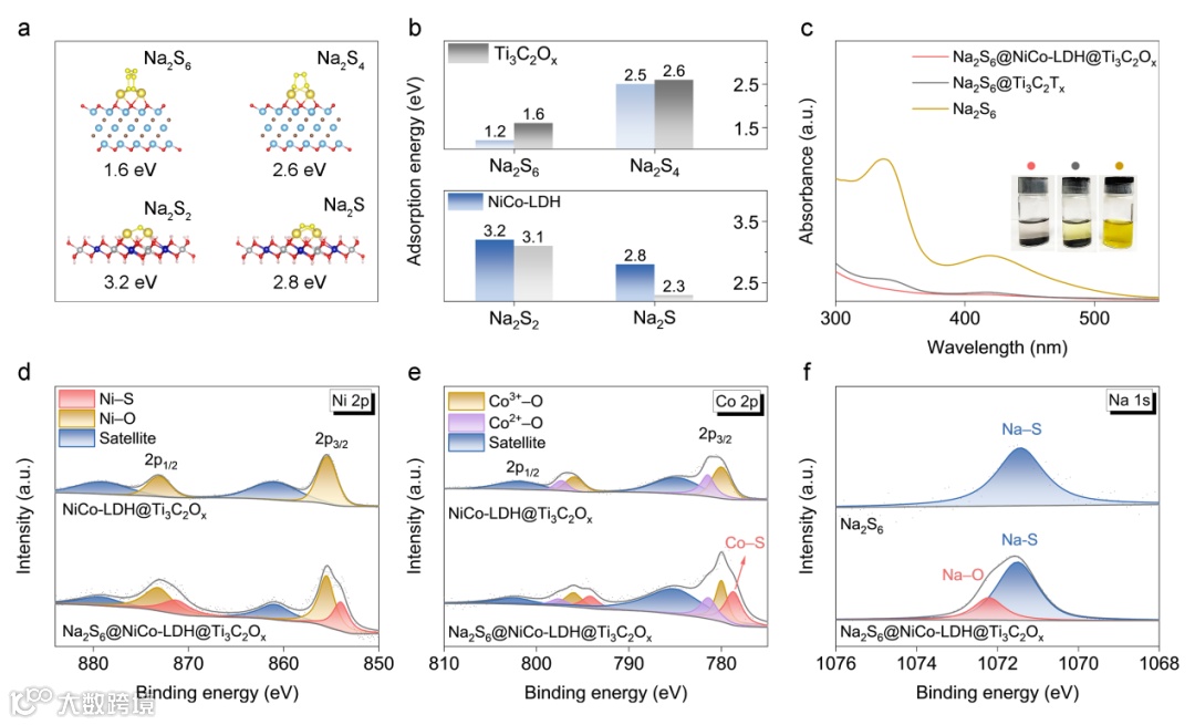 DFT结果显示,NiCo-LDH和MXene对多硫化物均表现出较强的吸附能力。值得注意的是,MXene倾向于吸附Na2S6和Na2S4分子,而NiCo-LDH则倾向于吸附Na2S2和Na2S分子。显然,两种组分对不同多硫化物的吸附具有一定的选择性,而复合材料对所有多硫化物的吸附效果更佳,这是两者协同作用的结果。XPS数据证明多硫化物和NiCo-LDH@Ti3C2Ox的化学吸附源于Ni/Co–S键和O–Na键的共同作用,这种双重的化学吸附作用不仅能有效抑制多硫化物的穿梭效应,还能加快反应速率。