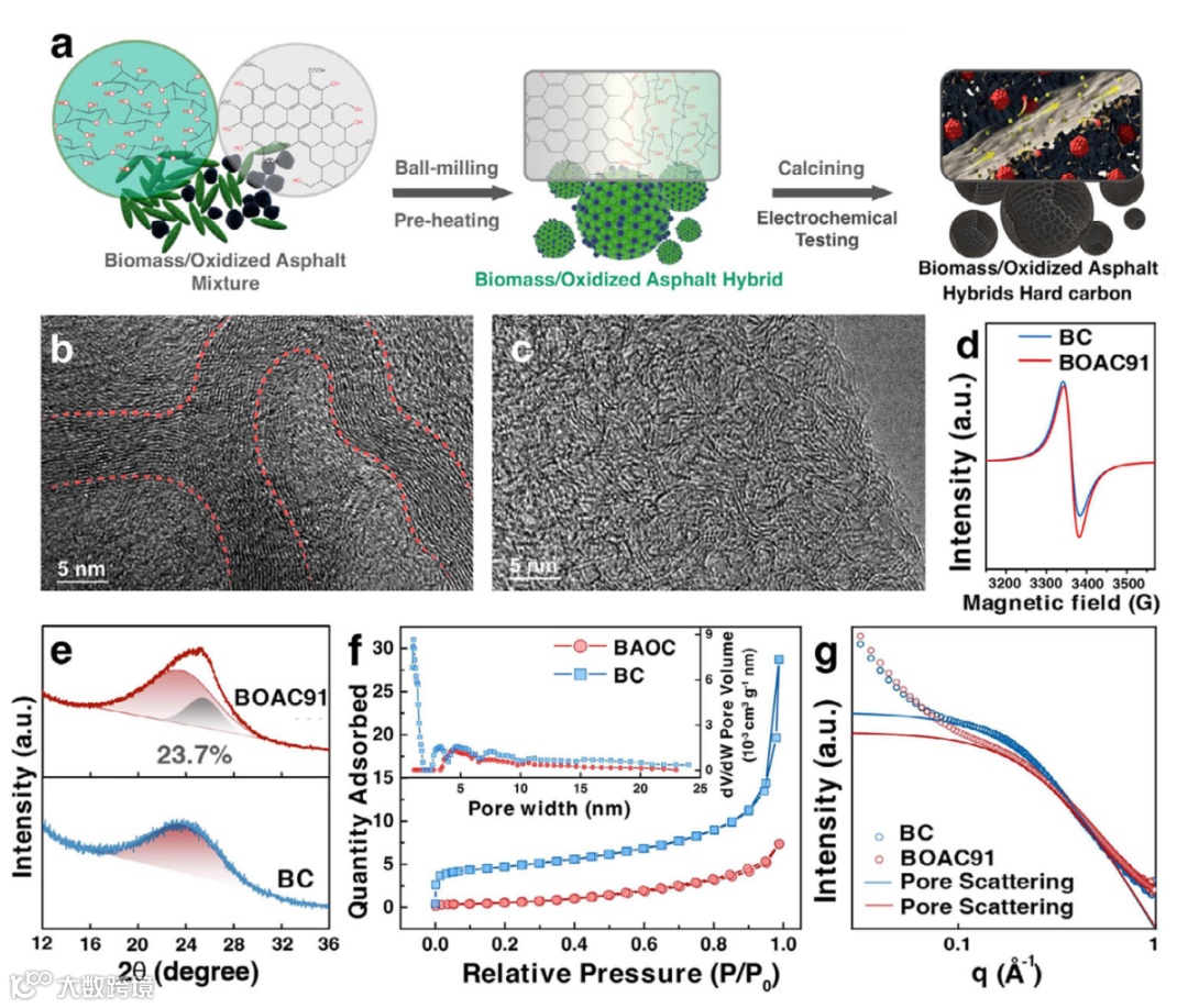 采用油茶壳作为硬碳前驱体,煤沥青作为软碳前驱体,通过预氧化引入氧功能团,促进两者化学交联。随后经球磨和高温碳化,获得长程类石墨纳米带原位嵌入无定形碳基体的异质结构(BOAC91)。透射电子显微镜(TEM)显示纳米带具有扩展层间距(0.458 nm),电子顺磁共振(EPR)和X射线衍射(XRD)证实了其长程有序特征。氮气吸附/脱附和小角X射线散射(SAXS)表明,BOAC91具有低比表面积(2.06 m² g⁻¹)和较高闭孔体积,有利于提高初始库仑效率。