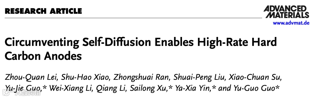 近日,中国科学院化学研究所郭玉国研究员、郭玉洁博士,新疆大学殷雅侠教授,与北京化工大学徐赛龙教授联合,在知名期刊Advanced Materials上刊登了题为“Circumventing Self-Diffusion Enables High-Rate Hard Carbon Anodes”的研究论文。该研究揭示了硬碳在低电压区钠传输迟缓的内在原因,并利用生物质与氧化沥青的交联方式,在无序碳基质中构建了长程类石墨纳米带,大幅提高了钠离子传输动力学。