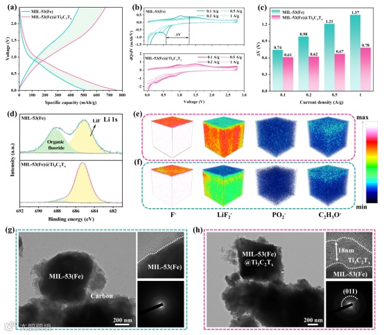 图5. (a)充放电曲线,(b)微分电容曲线,(c)极化电位的比较,(d)循环后XPS中的Li 1s轨道分析,MIL-53(Fe)(e)和MIL-53(Fe)@Ti3C2Tx(f)在200次循环后的的TOF-SIMS,MIL-53(Fe)(g)和MIL-53(Fe)@Ti3C2Tx(h)在200次循环后的微观形貌及晶体结构。