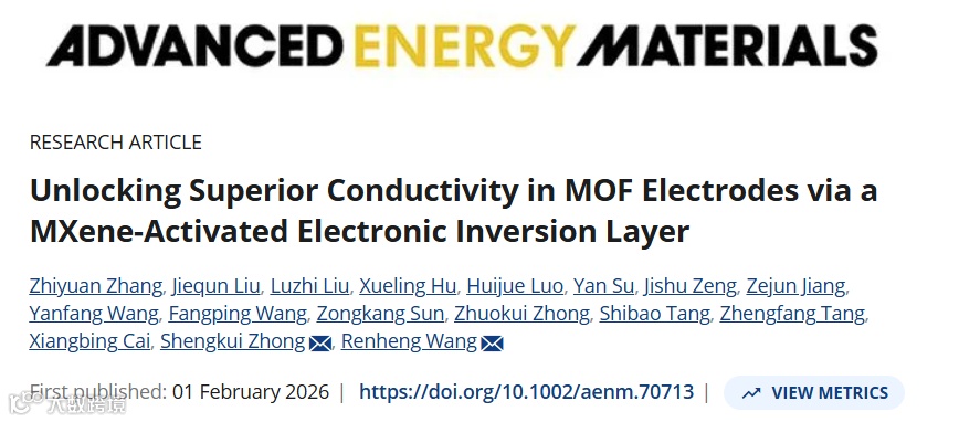 近日,广西机电职业技术学院广西光储直柔工程研究中心钟胜奎教授,与深圳大学王任衡研究员合作,在国际知名期刊 Advanced Energy Materials 上发表了题为“Unlocking Superior Conductivity in MOF Electrodes via a MXene-Activated Electronic Inversion Layer”的研究文章。