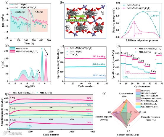 图4. (a)由GITT得到的锂离子扩散速率,锂离子迁移能垒的示意图(b)及其计算结果(c),(d)弛豫时间分布,(e)0.1A/g下的循环-比容量图,(f)不同电流密度下的倍率性能,(g)大电流密度下的循环-比容量测试结果,(h) MIL-53(Fe)@Ti3C2Tx与其他MIL-53(Fe)系列复合材料及MOF@MXene复合材料的比较。