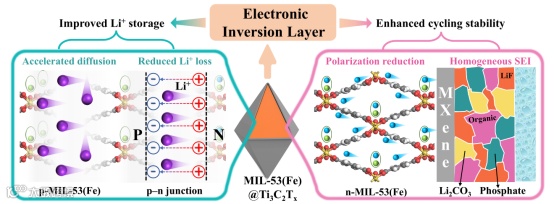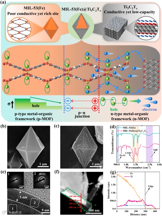 利用Ti3C2Tx的负电特性,与阳离子活化的MIL-53(Fe)进行静电自组装,从而将Ti3C2Tx表面的电子大量注入MIL-53(Fe),成功将其表面主要载流子从空穴转变为电子,显著提升了材料的电导率。同时,这种电子注入是局域性的,在次表面诱导形成了P-N结与内建电场,该电场与材料体相的空穴浓度梯度协同作用,共同提升了离子的扩散速率与材料的本征电导率。
