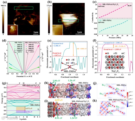由于Ti3C2Tx与MIL-53(Fe)之间存在显著的功函数差,Ti3C2Tx中的电子在能级平衡过程中流向MIL-53(Fe)。这一过程不仅抬升了MIL-53(Fe)的费米能级,更在其表面诱导产生了关键的“电子反型层”(EIL)。所谓反型,是指材料表面区域的多数载流子类型与体相相反——原本p型的MIL-53(Fe)体相以空穴导电为主,而其表面却因电子大量注入而形成富电子的n型通道。正是这个高迁移率的电子通道,为复合材料提供了跨越式的电导率提升。