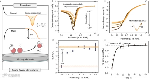 图4. EQCM识别预氧化界面上的吸附氧物种。a. 通过EQCM对吸附物种进行表征的溶出伏安法示意图;b. 不同电位预氧化后的氧物种还原峰;c. 不同电位预氧化后的界面质量变化;d. 不同预氧化电位下形成的氧中间体的质量变化与电子转移比;e. 在1.2 V下,预氧化时间和*O覆盖度之间的关系。