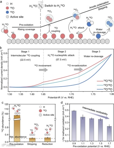 利用类溶出伏安法对*O进行标记并对其转化过程进行追踪。具体来说,在H218O中对电极界面进行预氧化实现*O的同位素标记,随后将电解液组分迅速切换为H216O,并进行阳极极化(图3. a)。在极化过程中,不同质荷比的O2具有不同的起始电位,18O18O、16O18O和16O16O依次析出(图3. b)。可以认为:首先,预氧化的18O发生分子间偶联形成36O2。随后,它被H216O亲核攻击,产生34O2。最终,水的再裂解和额外的电子转移使32O2在更高的过电位下产生。通过对类溶出伏安不同阶段的电解液进行稳定同位素分析,确定O2中的18O来源于界面氧(图3. c)。此外,预氧化后的甲醇氧化实验证明了不同的氧化电位会形成不同种类的界面氧物种(图3. d)。