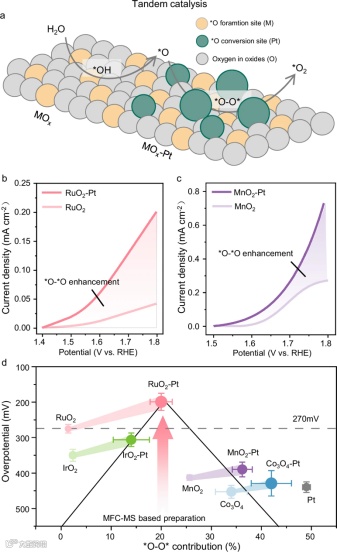 图6. 通过增强*O的形成和转化设计串联催化剂以降低OER过电位。 a. MOx-Pt串联催化界面的示意图;b. RuO2和RuO2-Pt的OER解析;c. MnO2和MnO2-Pt的OER解析;d. MOx-Pt催化剂上过电位和*O-O*贡献的火山图。