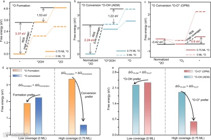 通过密度泛函理论计算*O覆盖度对OER反应中间体自由能的影响。随着*O覆盖度的升高,*O的形成能垒明显上升,*O-OH和*O-O*的能垒下降(图5. a-c)。这一趋势导致OER的RDS从*O的转化变为了*O生成,表明在高*O覆盖度下,*O在极化过程中会先发生*O的转化,随后再发生水裂解,从而保证了析出的O2完全来自于标记的*O(图5. d)。此外,随着覆盖度的升高,*O转化的的路径也从*O-OH切换为了*O-O*(图5. e)。这说明*O在高覆盖度下更倾向发生*O直接偶联的OPM机制。