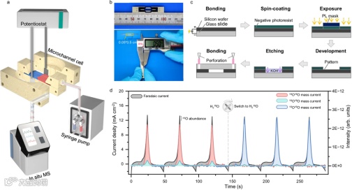 图2. 在MFC-MS控制的强制对流界面下在线观察OER。a. MFC-MS操作模式示意图;b. 微通道电化学池的图像和尺寸;c. 微通道电化学池的制造过程示意图;d. 在MFC-MS中,电解液中H216O和H218O切换时的循环伏安曲线和相应的质谱信号。