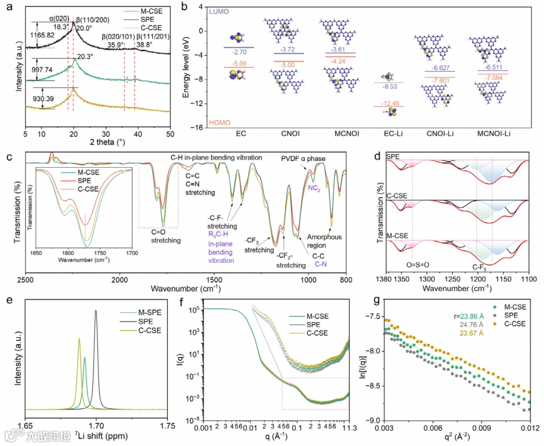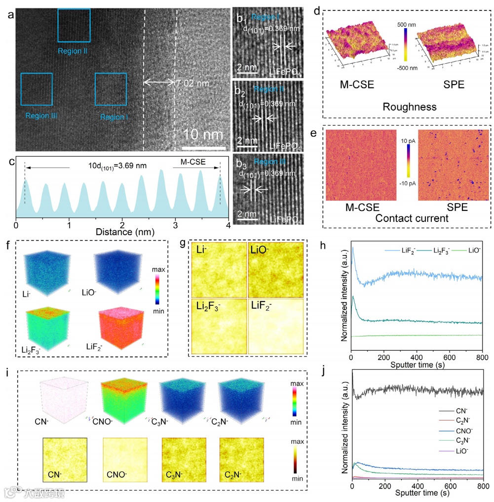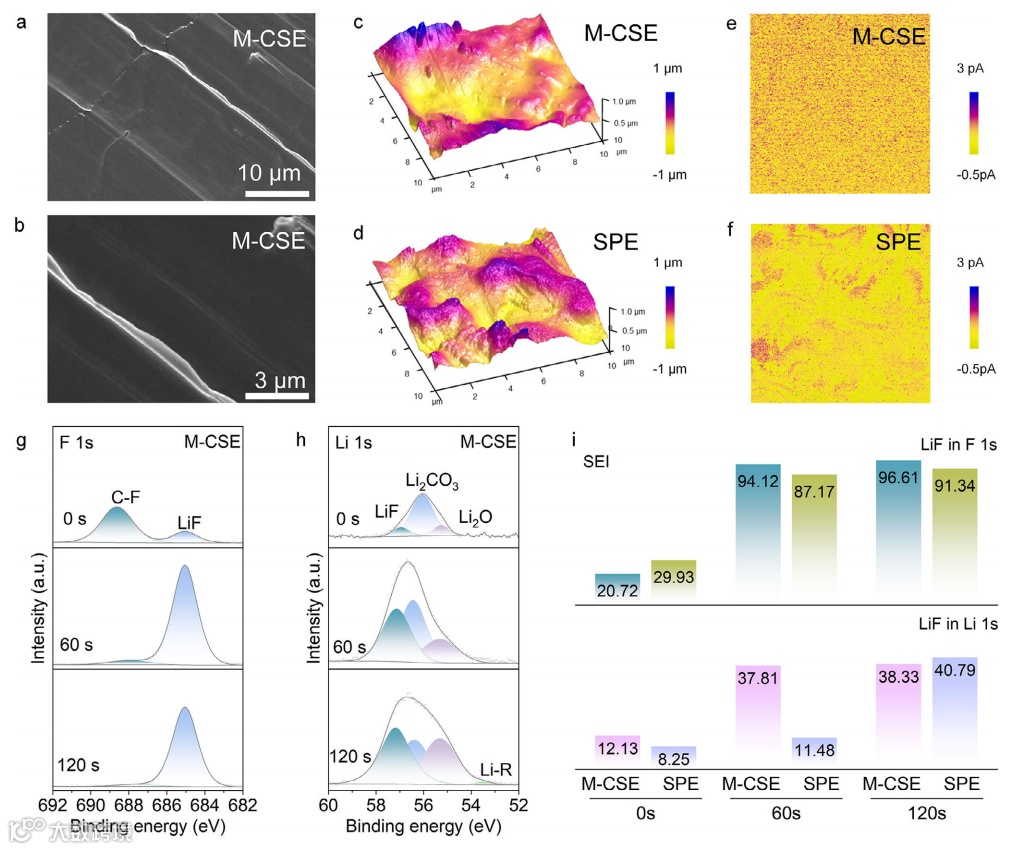 除了调节电解质本征电荷传输,MCNOI还诱导形成了梯度的有机-无机复合固体电解质界面(SEI)和正极电解质界面(CEI) 。XPS和TOF-SIMS深度剖析显示,M-CSE衍生的界面相呈现出“外层有机富集、内层无机富集”的梯度结构 。MCNOI衍生的含氮碎片(CN-, CNO-等)参与了界面构建,有效抑制了阴离子迁移,促进了均匀的锂沉积 。