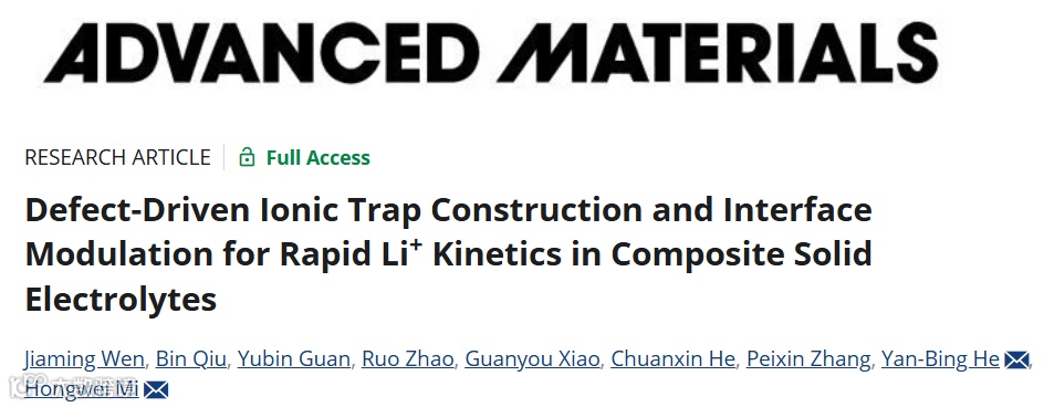 近日,深圳大学米宏伟教授与清华大学深圳国际研究生院贺艳兵教授合作,在国际顶级期刊 《Advanced Materials》 上发表题为“Defect-Driven Ionic Trap Construction and Interface Modulation for Rapid Li+ Kinetics in Composite Solid Electrolytes”的研究论文。该研究提出了一种“空间分布离子陷阱”框架,以阐明无机填料在调节离子迁移中的关键作用 。研究引入通过球磨改性的氮化碳(MCNOI),利用其丰富的氮空位构建了“浅离子陷阱”。与传统的形成“深离子陷阱”而固定Li+的碳化氮(CNOI)不同,MCNOI能够实现Li+的可逆捕获/释放,并构建连续的传导通路 。基于该策略优化的复合固态电解质(M-CSE)实现了高Li⁺迁移数(0.68)和超长循环稳定性(>1600 h),并助力全电池在 30 C 的超高倍率下工作 。