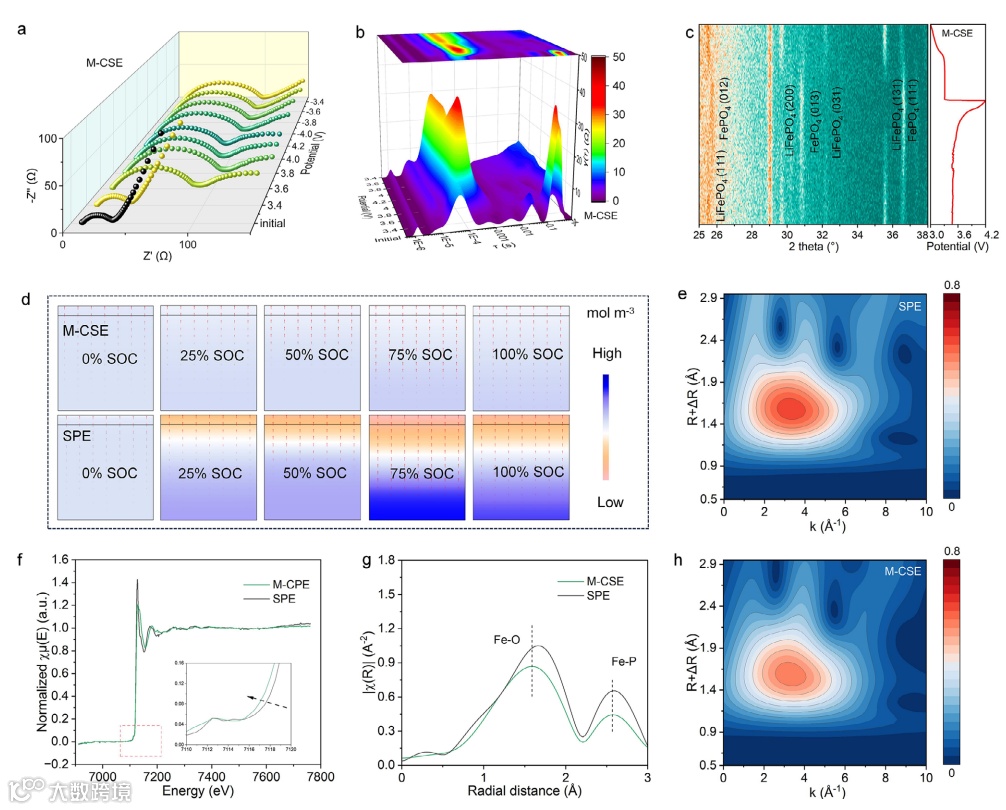 研究利用原位 XRD、原位 EIS 以及同步辐射 X 射线吸收光谱(EXAFS)深入探究了正极侧的演变 。结果表明,M-CSE 体系在循环过程中保持了高度可逆的 LiFePO4/FePO4 相变,且 Li+ 在正极内部的浓度分布均匀(COMSOL模拟验证) 。相比之下,无陷阱的 SPE 体系表现出明显的电压滞后和晶格畸变。这进一步证实了浅离子陷阱策略在维持正极结构完整性和实现快速电荷转移方面的关键作用。