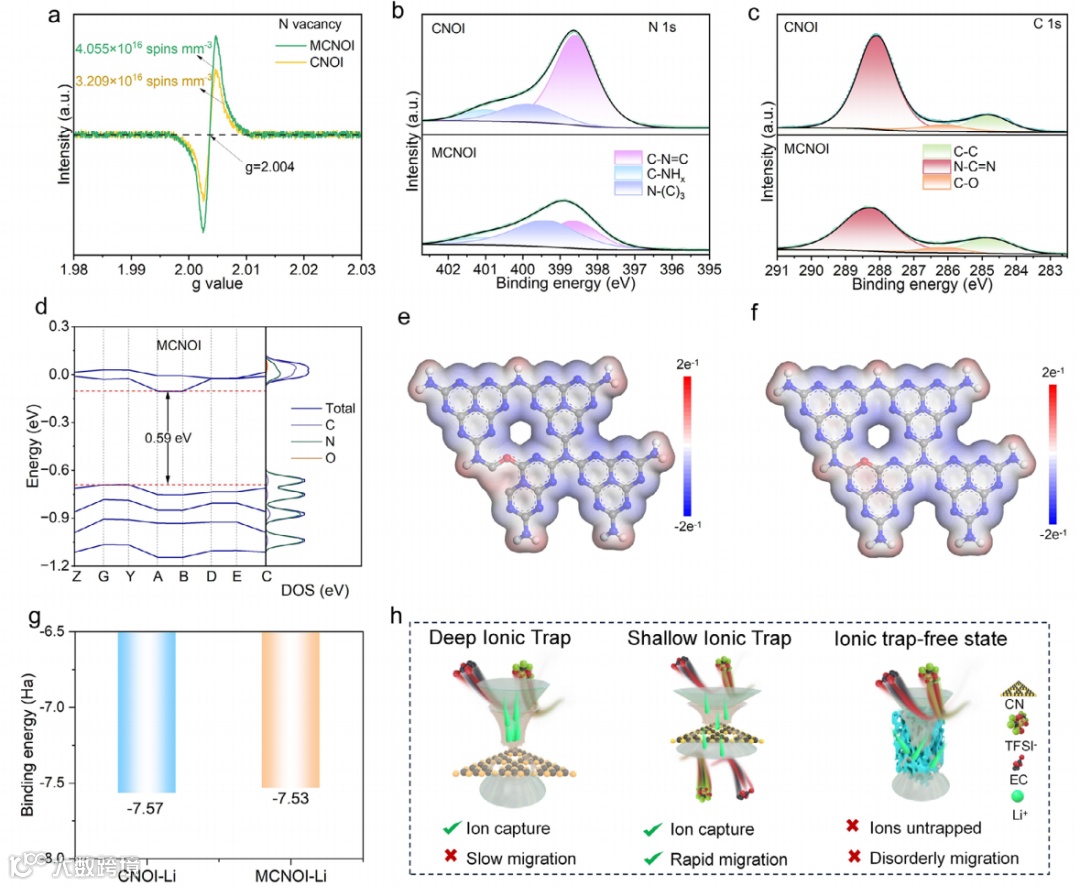 传统的碳化氮(CNOI)由于形成“深离子陷阱”,会固定Li+从而阻碍其快速传输;而未添加填料的聚合物电解质处于“无陷阱”状态,缺乏选择性位点,导致离子无序扩散 。作者通过球磨工艺制备了富含氮空位的改性碳化氮(MCNOI)。DFT计算和EPR测试表明,MCNOI中的缺陷位点充当“浅离子陷阱”,其与Li+的结合能(-7.53 Ha)弱于原始碳化氮(-7.57 Ha),这种微妙的结合强度既能选择性地锚定Li+(排除大体积的TFSI-阴离子),又能允许Li+在低能垒下通过空穴进行快速跃迁,从而实现高效的定向传输 。
