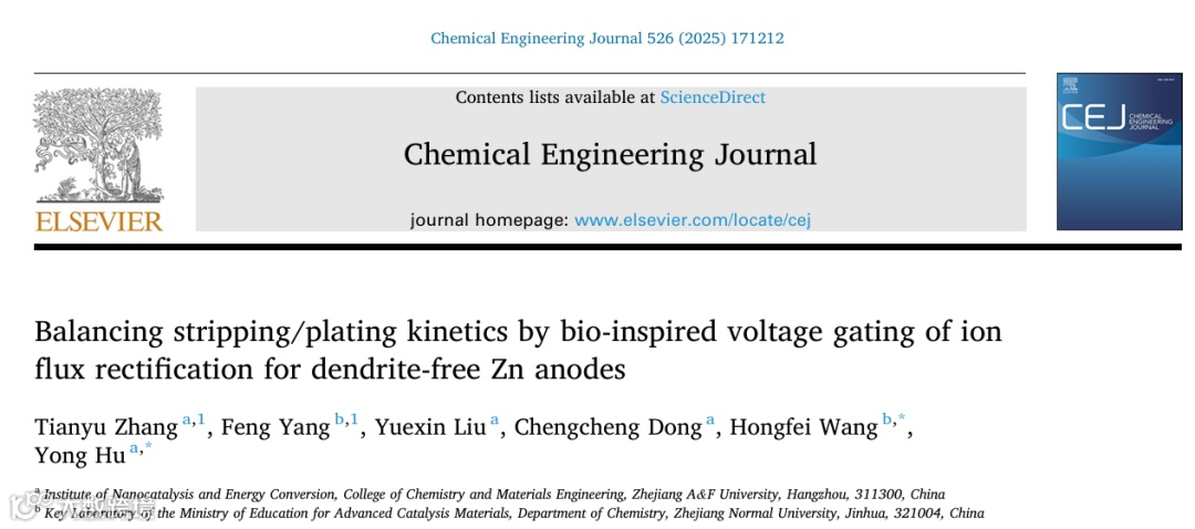 近日,来自浙江农林大学的胡勇教授与浙江师范大学的王宏飞博士合作,在国际知名期刊Chemical Engineering Journal上发表题为“Balancing stripping/plating kinetics by bio-inspired voltage gating of ion flux rectification for dendrite-free Zn anodes”的研究文章。受神经元电压门控离子通道启发,该研究文章报道了通过一种电压门控负极保护层同时平衡锌沉积与剥离的动力学并整流界面离子通量进而实现无枝晶锌负极。