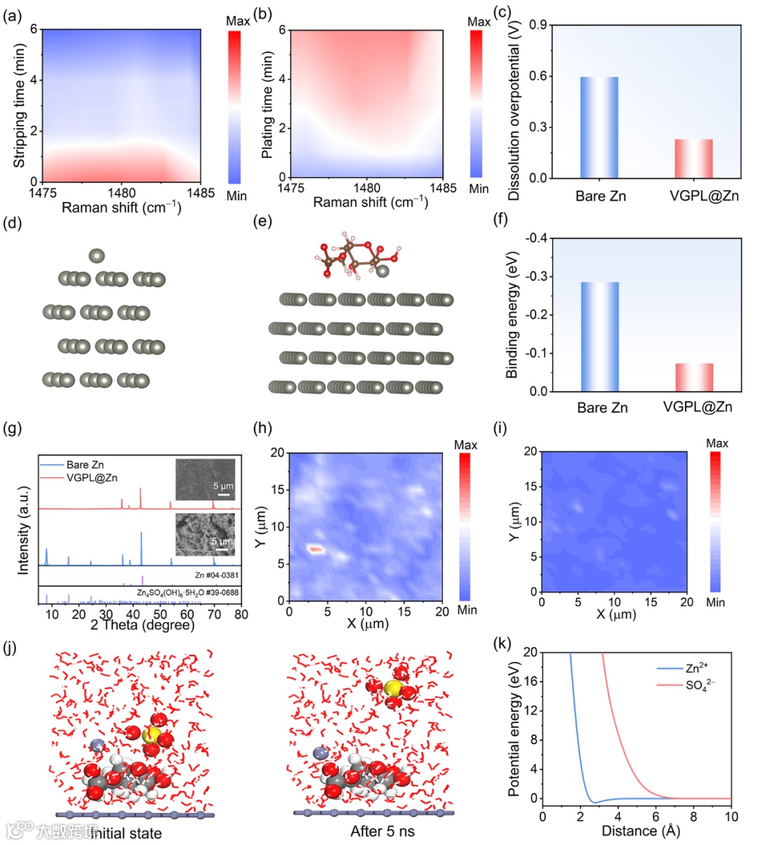 在剥离过程中,阳极界面呈正电场,VGPL发生动态重构,原位拉曼光直接观测到在剥离过程中,十六烷基三甲基溴化铵(CTAB)的特征峰消失,说明的CTAB从保护层中动态脱离。剩余的羧甲基纤维素(CMC)修饰的界面使Zn-Zn结合能从–0.29 eV(裸锌)显著降低至–0.07 eV,这意味着锌原子更容易从电极表面溶出。分子动力学(MD)模拟显示,CMC与SO42–之间的相互作用势能始终为正值(排斥),从而可以抑制副产物的生成。