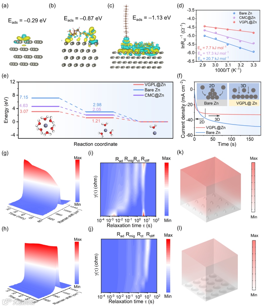 在电镀过程中,负极界面呈负电场,CTAB重新整合到保护层中,CTAB的垂直排列疏水烷基链指向电解质,CTAB的疏水界面为[Zn(H2O)6]2+的脱溶剂化提供了有利环境,DFT计算进一步显示,水合锌离子沿CTAB烷基链脱水的每一步能垒都更低。COMSOL模拟直观地展示了VGPL@Zn电极表面的Zn2+浓度梯度远小于裸锌电极,验证了保护层均化离子流、抑制枝晶的能力。