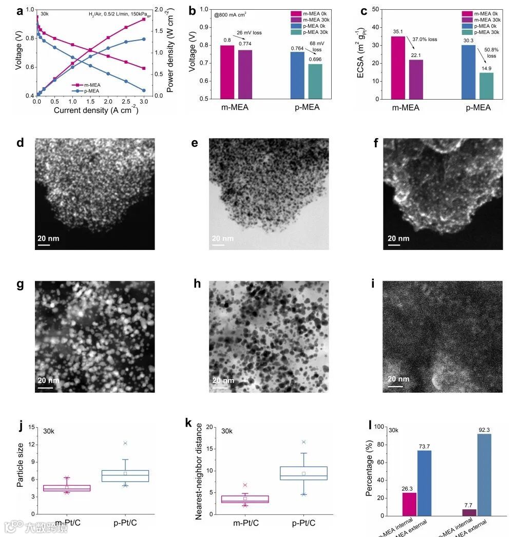 图5. 稳定性评估。(a) m-MEA和p-MEA经过30k次加速应力测试循环后的H₂/空气极化曲线对比(AST方案:0.6 V(3 s)与0.95 V(3 s)方波循环;极化测试条件:阳极/阴极流速0.5/2 L min⁻¹,相对湿度100%,背压150 kPa)。(b) m-MEA和p-MEA在800 mA cm⁻²下老化前后的电压衰减值对比。(c) m-MEA和p-MEA老化前后的电化学活性面积损失对比。(d) 老化后m-MEA催化剂的HAADF-STEM图像。(e) 同(d)区域的老化m-MEA催化剂SE图像。(f) 同(d)区域的老化m-MEA催化剂明场TEM图像。(g) 老化后p-MEA催化剂的HAADF-STEM图像。(h) 同(g)区域的老化p-MEA催化剂SE图像。(i) 同(g)区域的老化p-MEA催化剂明场TEM图像。(j) 老化后m-MEA和p-MEA催化剂纳米颗粒粒径分布的箱线图对比。(k) 老化后m-MEA和p-MEA催化剂中单个铂纳米颗粒间最近邻距离的箱线图对比。(l) m-MEA和p-MEA催化剂老化前后位于孔道内与孔道外铂纳米颗粒比例的变化。