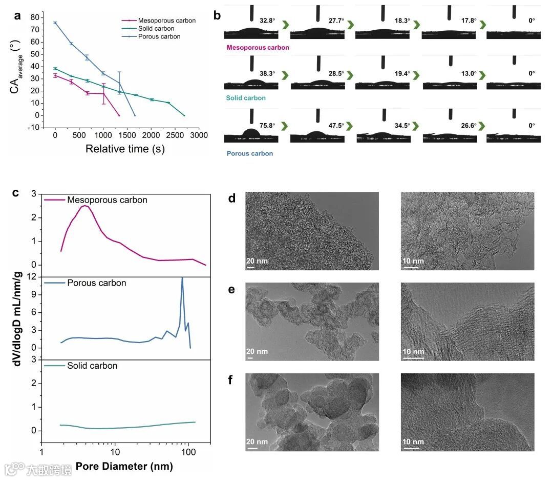 图2. 碳载体的物理性质表征。(a) 两端平均水接触角随相对时间变化图。(b) 动态水接触角曲线图。(c) 碳载体的BJH孔径分布图。(d) 介孔碳的TEM图像。(e) 多孔碳的TEM图像。(f) 固体碳的TEM图像。