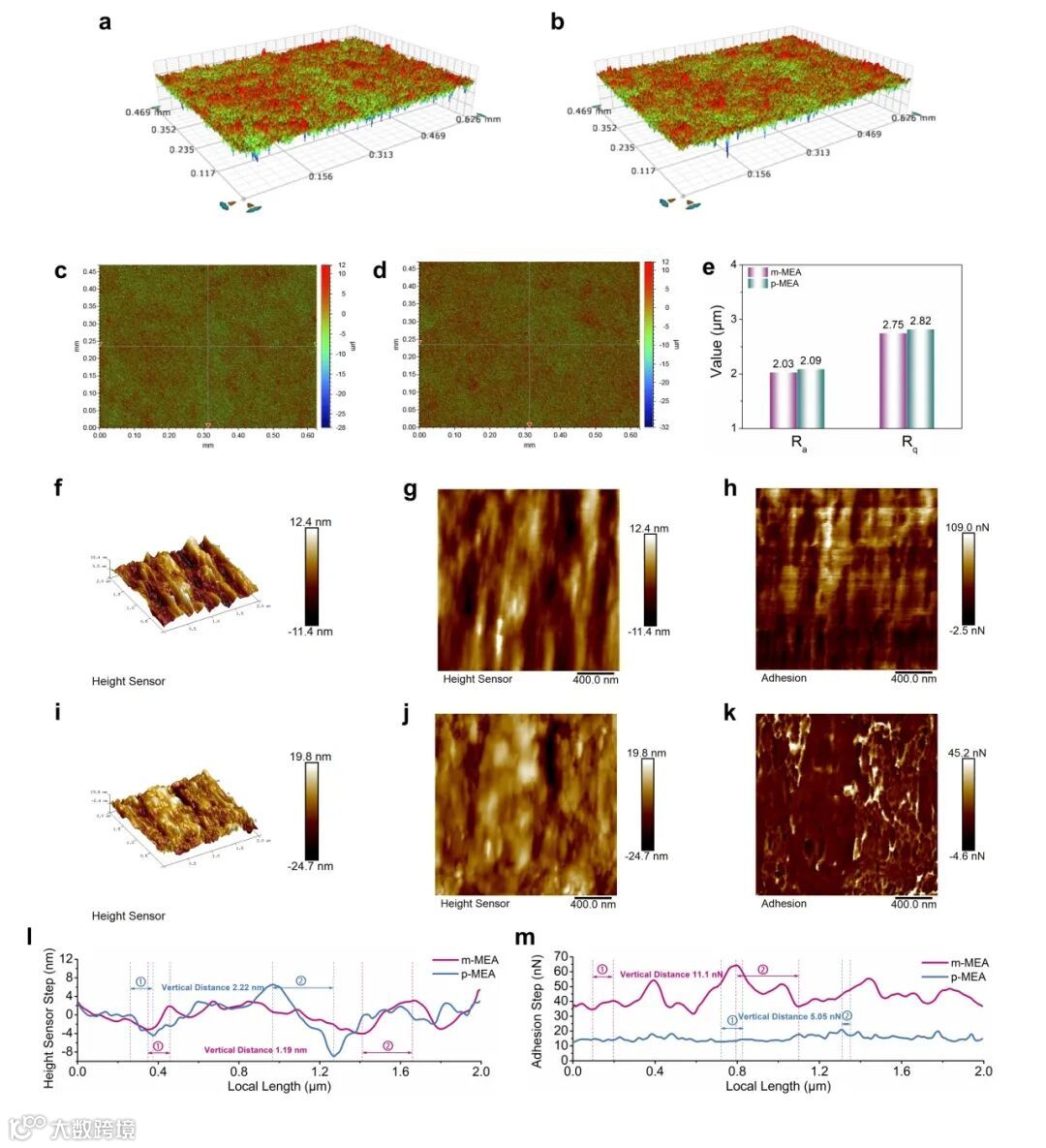 图6. 催化剂层表面平整度与内部三相界面表征。(a) m-MEA电极表面的三维白光干涉仪光学轮廓图像。(b) p-MEA电极表面的三维WLI图像。(c) m-MEA电极表面的二维WLI图像。(d) p-MEA电极表面的二维WLI图像。(e) m-MEA与p-MEA表面粗糙度系数(Ra与Rq)对比。(f) m-MEA电极横截面的三维AFM高度图。(g) m-MEA电极横截面的二维AFM高度图。(h) m-MEA电极横截面的AFM粘附力图。(i) p-MEA电极横截面的三维AFM高度图。(j) p-MEA电极横截面的二维AFM高度图。(k) p-MEA电极横截面的AFM粘附力图。(l) m-MEA与p-MEA电极横截面AFM高度传感器步阶轮廓对比。(m) m-MEA与p-MEA电极横截面AFM粘附力步阶轮廓对比。