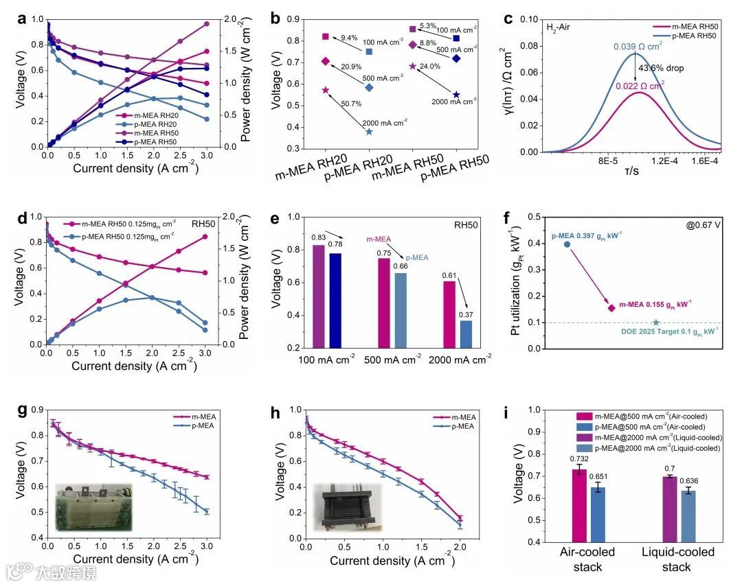 图3. MEA及短堆在低湿度下的性能表现。(a) 总载量为0.3 mgPt cm⁻²的m-MEA和p-MEA 20%及50%相对湿度下的H₂/空气极化曲线(测试条件:阳极/阴极流速0.5/2 L min⁻¹,背压150 kPa)。(b) m-MEA和p-MEA在20%和50%相对湿度下,于100、500及2000 mA cm⁻²时的电压对比。(c) m-MEA和p-MEA在50%相对湿度下的DRT质子传导电阻对比。(d) 总载量为0.125 mgPt cm⁻²的m-MEA和p-MEA在50%相对湿度下的H₂/空气极化曲线(测试条件:阳极/阴极流速0.5/2 L min⁻¹,背压150 kPa)。(e) 在总载量0.125 mgPt cm⁻²、50%相对湿度下,m-MEA和p-MEA于100、500及2000 mA cm⁻²时的电压对比。(f) 铂利用率对比。(g) 全尺寸液冷短堆性能对比(电堆参数:10节单电池,单池活性面积350 cm²;测试条件:阳极/阴极化学计量比1.8/2,背压150 kPa,相对湿度50%,电堆温度85 °C)。(h) 风冷短堆性能表现(电堆参数:10节单电池,单池活性面积16.8 cm²;测试条件:强制风冷供气,常压,环境电堆温度)。(i) m-MEA和p-MEA在风冷电堆500 mA cm⁻²和液冷电堆2000 mA cm⁻²下的电压性能对比。