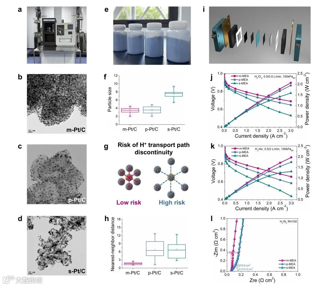 图1. 催化剂表征与MEA性能比较评估。(a) 用于连续流微波辅助大规模生产催化剂的装置。(b) 高铂位点密度介孔碳负载催化剂的TEM图像。(c) 传统多孔碳负载催化剂的TEM图像。(d) 传统固体碳负载催化剂的TEM图像。(e) 大规模生产的高铂位点密度介孔碳催化剂照片。(f) 催化剂纳米颗粒粒径分布的箱线图。(g) 高铂位点密度优势示意图。(h) 单个铂纳米颗粒间最近邻距离的箱线图。(i) MEA单电池测试构型示意图。(j) H₂/O₂极化曲线(测试条件:阳极/阴极流速0.5/0.5 L min⁻¹,背压100 kPa)。(k) H₂/空气极化曲线(测试条件:阳极/阴极流速0.5/2 L min⁻¹,背压150 kPa)。(l) 质子传导电阻分析。