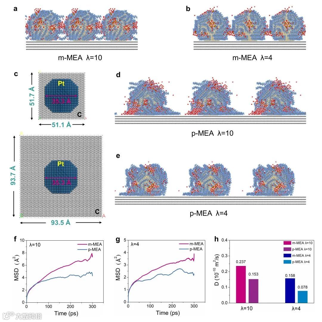 图4. 分子动力学模拟。(a, b) 分别为m-MEA在水合水平λ=10和λ=4时的模拟快照(分子模型着色如下:水分子为红白两色,离聚物为棕蓝两色,碳载体基底为棕色球面层,铂纳米颗粒为中心聚集的黄色球体)。(c) m-MEA(上)和p-MEA(下)模型的模拟构架与分子结构。(d, e) 分别为p-MEA在水合水平λ=10和λ=4时的模拟快照。(f) m-MEA和p-MEA电极在λ=10时H₃O⁺离子的均方位移曲线。(g) m-MEA和p-MEA电极在λ=4时H₃O⁺离子的均方位移曲线。(h) m-MEA和p-MEA电极在水合水平λ=10和λ=4时H₃O⁺扩散系数对比分析。
