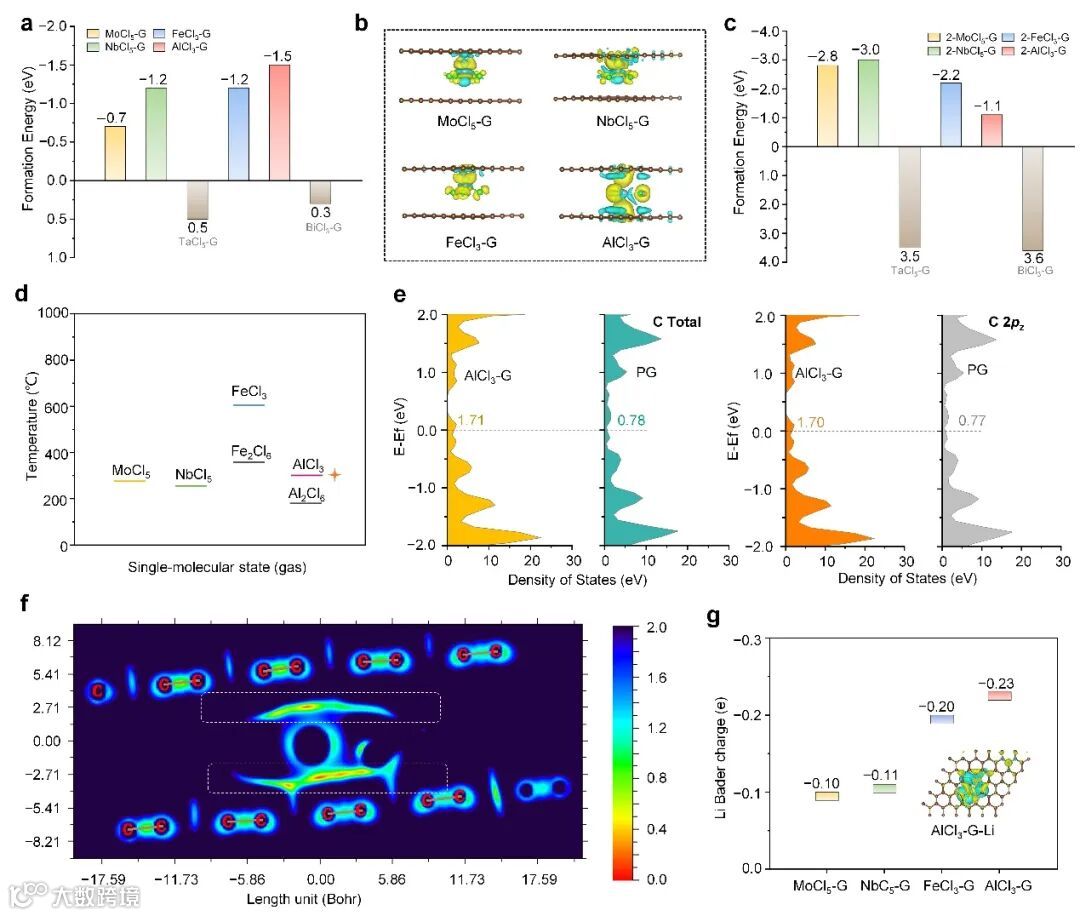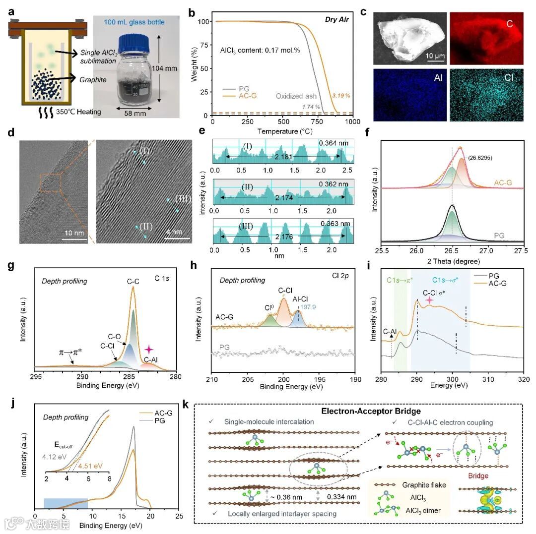 (1)通过石墨层间化合物的合成方法优化,成功将单分子氯化铝插入,并形成特殊的电子耦合桥“C-Al-Cl-C”键,该方法具备大规模生产潜力。