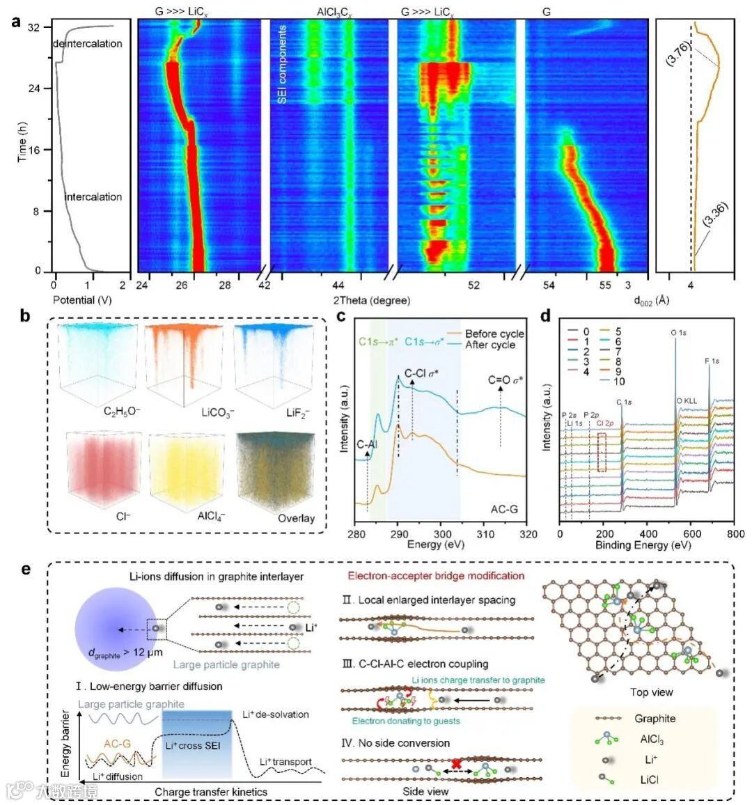 EELS与XPS颗粒溅射证明,循环后电子耦合桥“C-Al-Cl-C”键依旧在石墨层间稳定存在。 -