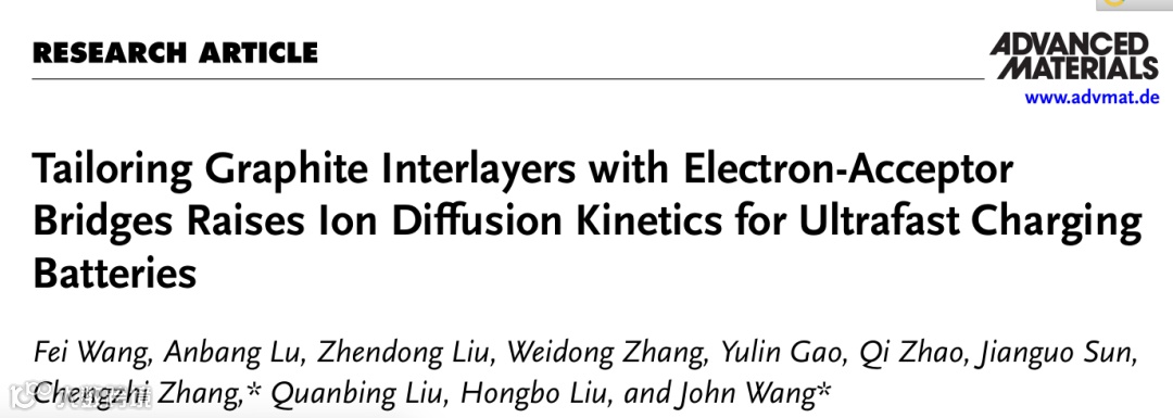 近日,由新加坡国立大学John Wang教授团队领衔,在国际知名期刊Advanced Materials上发表题为“Tailoring Graphite Interlayers with Electron-Acceptor Bridges Raises Ion Diffusion Kinetics for Ultrafast Charging Batteries”的研究性文章。新加坡国立大学材料科学与工程系王飞博士与湖南大学材料科学与工程学院博士生卢安邦为该论文第一作者。湖南大学刘洪波教授为本论文提供材料设计合成指导,华南理工大学博士生刘振东参与本论文理论计算,季华实验室与佛山宏璟新能源有限公司为本论文提供商业化锂电池测试。