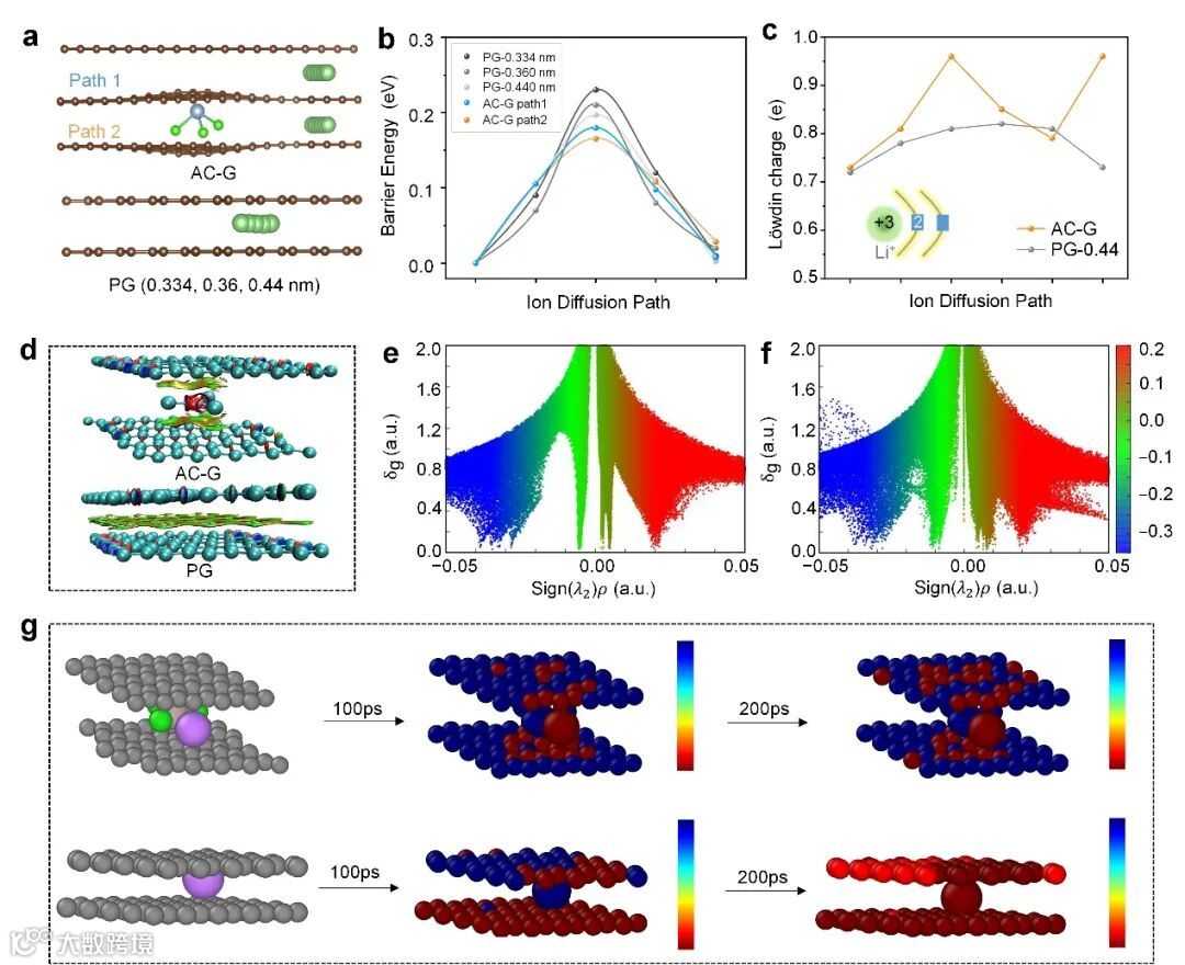 (3)设计的Electron-Acceptor桥”石墨展现出低的层间迁移能垒和弱的空间位阻效应,同时微扩层行为还有效缓解了快充时碳原子间的应力集中。