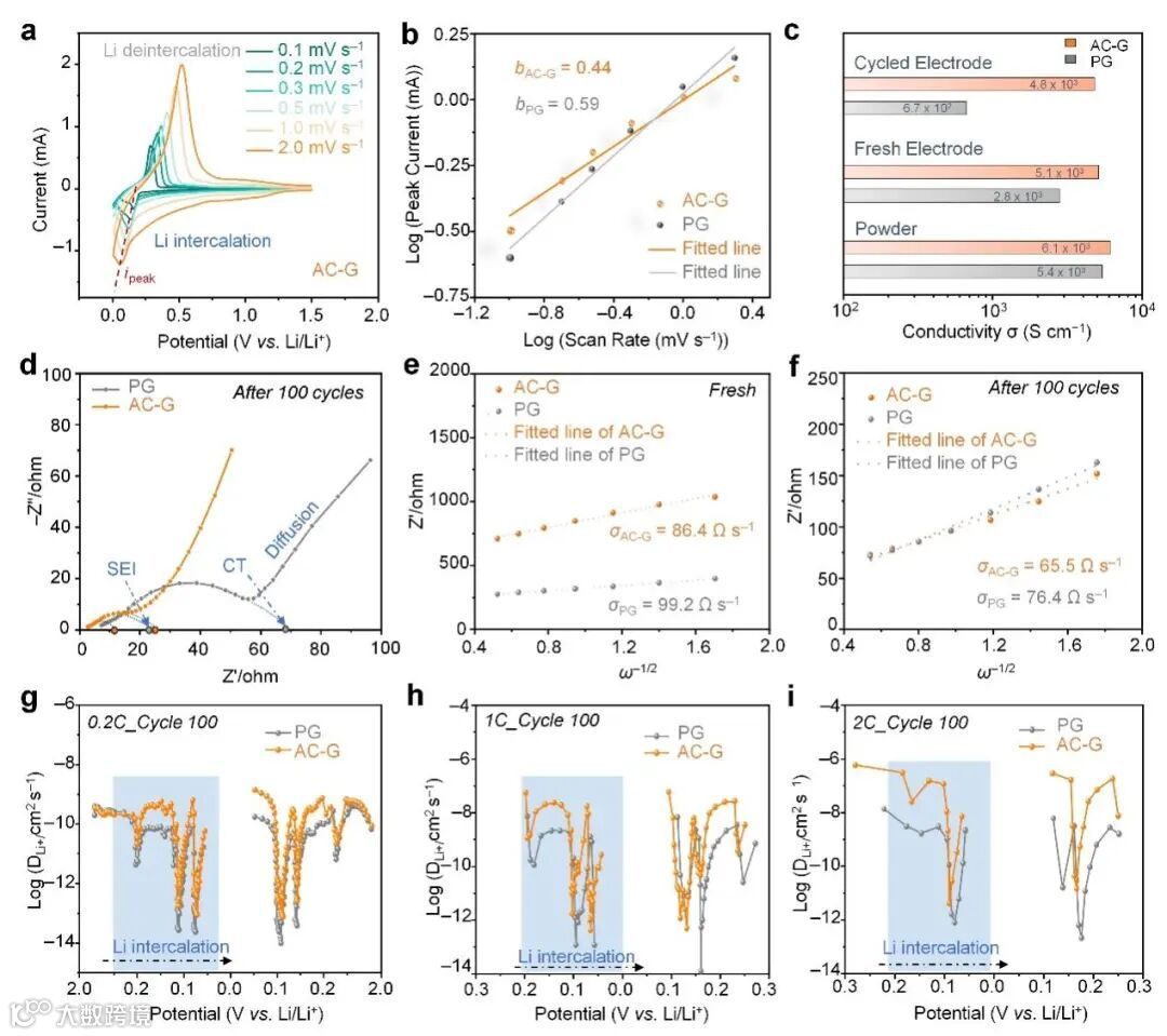 (1)设计的Electron-Acceptor桥”石墨具备低的锂离子界面传输和固相迁移阻抗