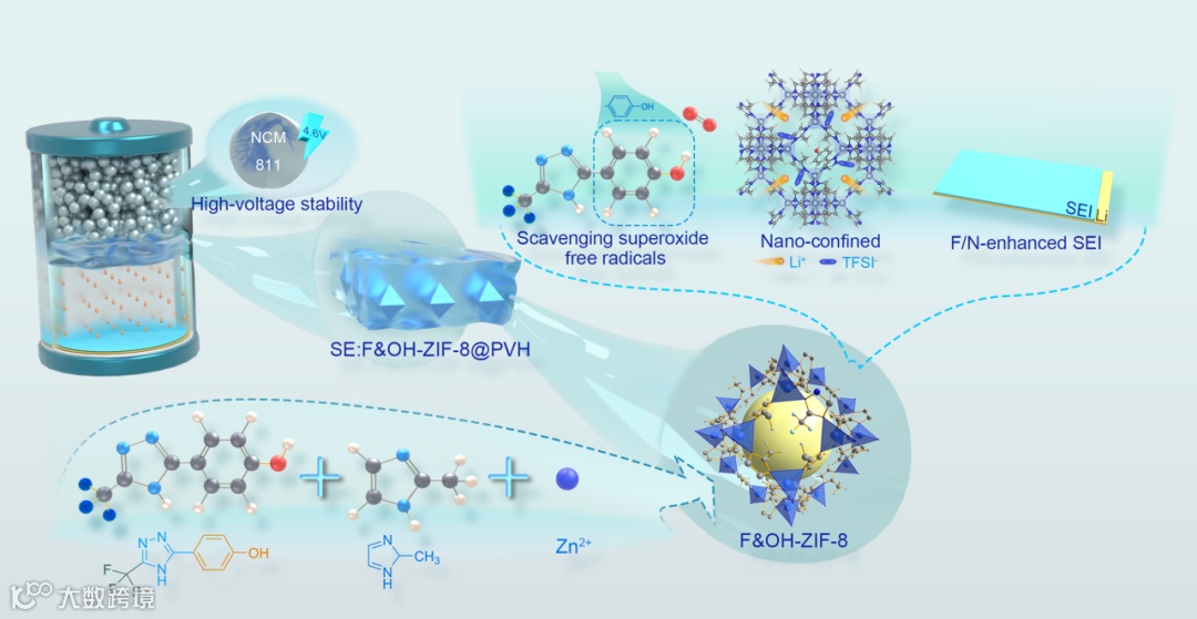 图 1. 氟基/酚基双杂化MOF在高电压固态锂金属电池中的构建与增强机制示意图。该三重协同增强效应包括:Ar–OH基团清除超氧自由基 (O2⁻·), 三唑-Zn位点选择性吸附TFSI⁻提升锂离子迁移数以及三氟甲基优先分解形成富含LiF/Li3N的稳定SEI层。