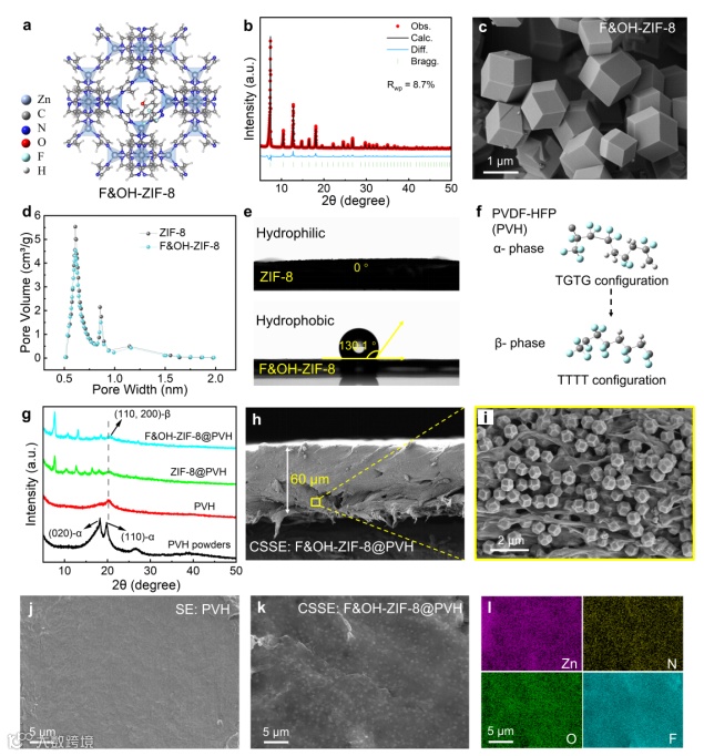 图 2. a) F&OH-ZIF-8晶体结构理论模型图;b) F&OH-ZIF-8的实验与精修XRD谱图;c) F&OH-ZIF-8粉末的SEM图像;d) ZIF-8和F&OH-ZIF-8的孔径分布曲线;e) ZIF-8和F&OH-ZIF-8的表面接触角测试;f) PVH聚合物分子构型图;g) PVH粉末及其复合电解质膜的XRD图谱;h) F&OH-ZIF-8@PVH复合电解质膜截面SEM图像;i) 高倍放大插图;j) PVH电解质膜表面SEM图像;k) F&OH-ZIF-8@PVH电解质膜表面SEM图像;l) F&OH-ZIF-8@PVH电解质膜表面EDS元素分布图。