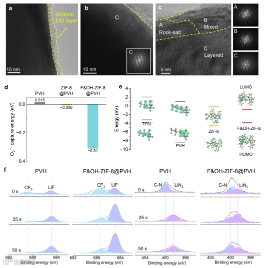 图 5. 高电压循环下的界面稳定性研究。a) F&OH-ZIF-8@PVH全电池循环20次后CEI的高分辨透射电镜图像;b, c) 循环20次后NCM811正极的微观结构演变:b) F&OH-ZIF-8@PVH和 c) PVH全电池中NCM811正极的TEM和FFT图像;d) DFT计算的PVDF-HFP基固态电解质与O₂⁻·的结合能;e) 分子的LUMO和HOMO能级值及相应的结构;f) 对称电池在0.2 mA cm⁻2下循环20次后SEI的XPS深度剖析。