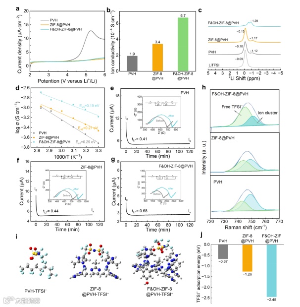 图 3. PVH基固态电解质的电化学性能与机理研究。a) 线性扫描伏安曲线;b) 基于阿伦尼乌斯公式拟合的离子电导率;c) ⁷Li NMR谱图;d) PVDF-HFP基电解质的阿伦尼乌斯曲线;e-g) 采用Bruce-Vincent方法计算的Li⁺迁移数;h) PVDF-HFP基固态电解质的拉曼光谱;i, j) DFT优化的PVDF-HFP基固态电解质与TFSI⁻的吸附构型及吸附能。