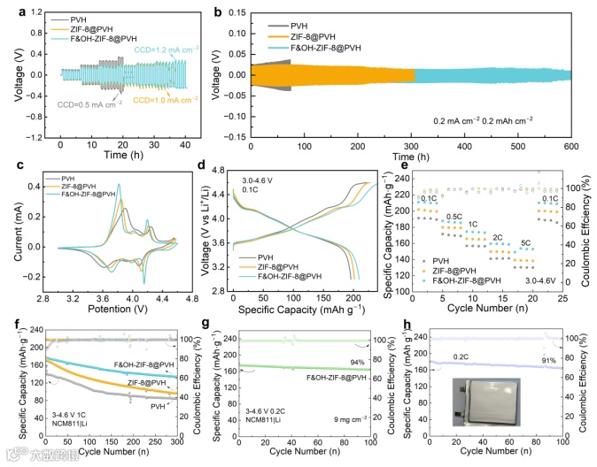 图 4. a) PVDF-HFP基复合固态电解质的临界电流密度测试曲线;b) 锂对称电池的长循环稳定性;c) 采用PVH、ZIF-8@PVH和F&OH-ZIF-8@PVH电解质的Li‖NCM811电池的循环伏安曲线;d) 电池在0.1C倍率下的首圈充放电曲线;e) 倍率性能测试;f) 2C高倍率下的长循环性能;g) 高负载条件下的1C循环性能;h) 软包电池的循环稳定性(电压窗口:3.0-4.6 V)。