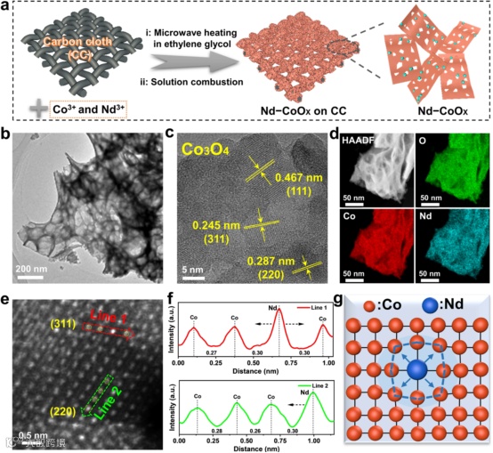 采用微波辅助加热(MAH)与溶液燃烧合成(SCS)结合的两步法。首先将碳布浸入Co2+与 Nd3+混合溶液中微波加热负载,随后通过多次溶液燃烧快速氧化,形成富含氧空位和Nd原子分散的Co3O4基多孔纳米片。XRD表征表明催化剂物相主要为Co3O4,球差电镜观察到大原子Nd成功插入了Co3O4的晶格中,同时因原子半径的差异引发局部结构压缩(Co-O键变短),形成了独特的应力场,为“呼吸模式”奠定了结构基础。