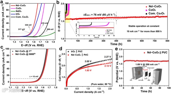 活性优势:Nd-CoOx在10 mA cm⁻²时的过电位为317 mV(低于商业 IrO₂的 335 mV),塔菲尔斜率 82 mV dec⁻¹,电荷转移电阻仅 8.9 Ω,电催化活性表面积(ECSA)显著高于未掺杂 CoOₓ;