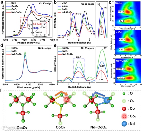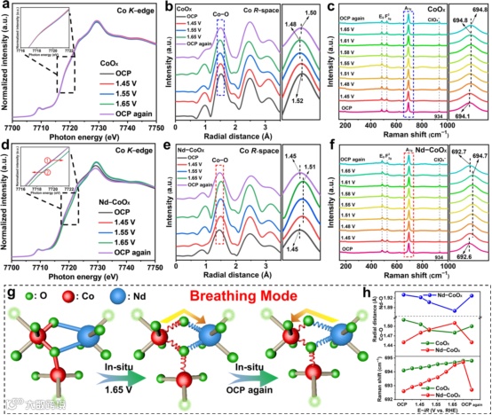结构稳定性机理:通过原位XAS与原位拉曼光谱分析发现,CoOx在加工作电位时,发生了Co-O键不可逆的持续缩短,这也是其催化剂结构崩塌的主要原因。不同的是,Nd-CoOx在施加工作电位后,Nd–O键发生缩短,而Co–O键则相应伸长,反应结束后两者键长均可逆地恢复至初始状态。该可逆键长变化源于材料在初始状态下即已存在的Co–O键收缩,为后续在析氧反应过程中Nd–O与Co–O键的协同“压缩–拉伸”振动(即“呼吸模式”)提供了结构基础。这一动态自适应机制有效耗散了原子尺度下的局部结构应力抑制了不可逆晶格畸变或相变的发生。Nd掺杂所诱导的“呼吸模式”显著缓解了Co基催化剂在酸性环境中常见的晶格失稳和元素溶解问题,是其实现长期耐久性的关键机理。