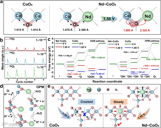 活性增强机理:理论计算不仅计算了常规的反应路径,还计算了施加电位时Nd-CoOx的催化路径。结合DEMS结果均表明Nd-CoOx体系中的OER过程倾向于遵循氧化物路径机制(OPM),而非传统的吸附物演化机制(AEM)。OPM路径通过直接耦合晶格氧参与O–O键形成,有效规避了AEM路径中涉及∗OOH等高能中间体的步骤,从而将反应能垒降低至1.879 eV,显著提升了反应动力学效率。