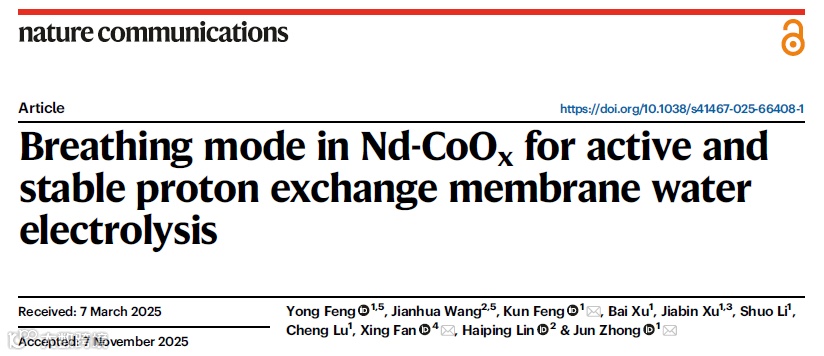 近日,苏州大学钟俊教授/冯坤副教授团队与北京大学樊星等合作,在Nature Communications上发表题为“Breathing mode in Nd-CoOxfor active and stable proton exchange membrane water electrolysis”的研究论文。该工作通过Nd掺杂和氧空位协同调控,开发出具有“呼吸模式”的Nd-CoOx催化剂,在酸性氧析出反应中实现317 mV的低过电位,并稳定运行超过800小时。原位表征和理论计算表明,Nd的引入通过可逆的键长变化缓解结构应力,显著提升催化剂的稳定性与反应动力学。