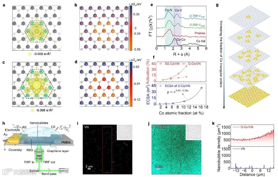 DFT 计算揭示:Co 三角有序单元向邻近 V 原子转移电子,使其氢吸附自由能 ΔGH* 接近 0,实现对 VN 基底的“邻位激活”;