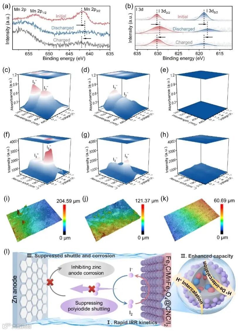 图 6. 高分辨率(a)锰 2p 和(b)碘 3d XPS 光谱,分别显示了 Fe3C/MnFe2O4@CNC/I2电池在初始状态、完全放电状态和完全充电状态下的情况。(c)Fe3C@CNC/I2、(d)Fe3C/MnFe2O4@FNC/I2和(e)Fe3C/MnFe2O4@CNC/I2在充放电过程中的操作中可见光光谱。(f)Fe3C@CNC/I2、(g)Fe3C/MnFe2O4@FNC/I2和(h)Fe3C/MnFe2O4@CNC/I2在充放电过程中的操作拉曼光谱。(i)与(j)、(k)所示的循环锌阳极以及(l)所示的Fe3C@CNC/I2、Fe3C/MnFe2O4@FNC/I2和Fe3C/MnFe2O4@CNC/I2负极在 10 A g–1 条件下的 CLSM 图像,(m)Fe3C/MnFe2O4@CNC的增强机制示意图。
